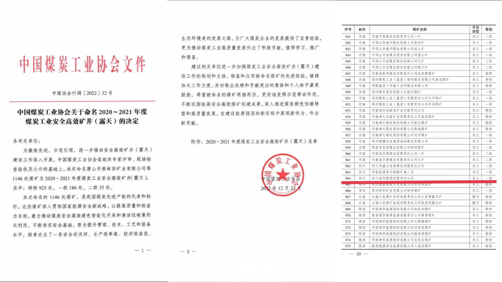 12月22日,根據(jù)《中國煤炭工業(yè)協(xié)會關于命名2020-2021年度煤炭工業(yè)安全高效礦井(露天)的決定》(中煤協(xié)會行調〔2022〕32號)文件,嘉陽集團嘉陽煤礦從全國一千一百多家煤礦企業(yè)中脫穎而出,被命名為全國煤炭工業(yè)安全高效一級礦井(露天),蟬聯(lián)這一殊榮。