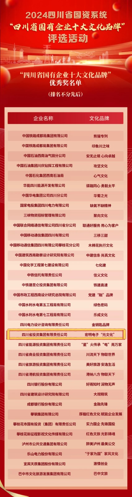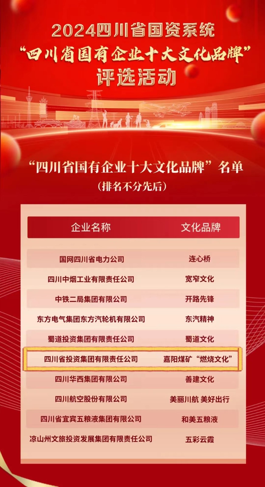 5月28日,省國(guó)資委正式發(fā)布“四川省國(guó)有企業(yè)十大文化品牌”名單和10個(gè)提名獎(jiǎng)、35個(gè)優(yōu)秀獎(jiǎng)品牌名單,川投集團(tuán)榜上有名。其中,川投集團(tuán)嘉陽(yáng)煤礦“燃燒文化”獲評(píng)“四川省國(guó)有企業(yè)十大文化品牌”,宏明電子“元文化”獲評(píng)“四川省國(guó)有企業(yè)十大文化品牌”優(yōu)秀獎(jiǎng)。