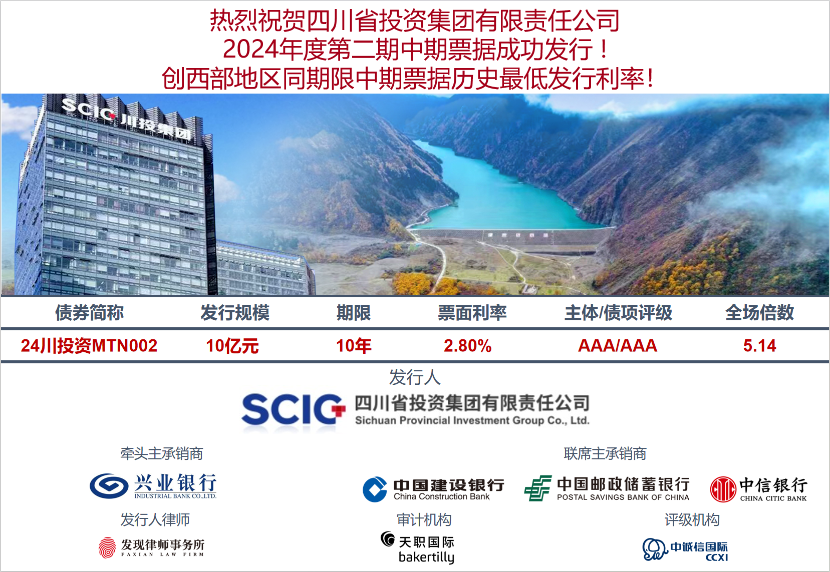 5月31日,集團公司成功發(fā)行2024年度第二期中期票據(jù),發(fā)行規(guī)模10億元,期限10年,發(fā)行利率2.80%,該期債券是川投集團成立以來發(fā)行的期限最長的債券,同時也創(chuàng)下了西部地區(qū)十年期中期票據(jù)歷史最低發(fā)行利率紀錄。