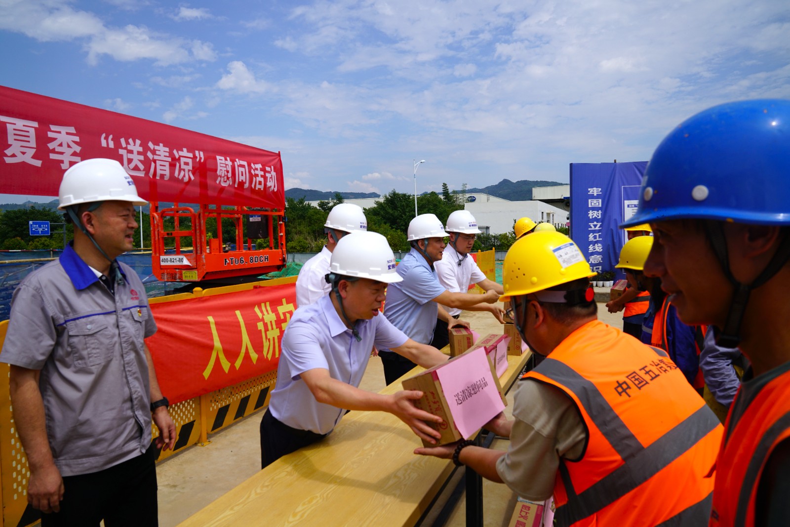 隨后,肖長青在施工現(xiàn)場與一線建設工人進行親切交談,詢問工作、生活情況,感謝他們的堅守和付出,并叮囑要樹牢安全意識,合理調配工作時間,注意防暑降溫,以健康的身體和飽滿的精神狀態(tài)投入建設工作中。隨后,他為項目建設一線員工送上了水果、涼茶等防暑降溫物品,切實把關懷送到員工手中。