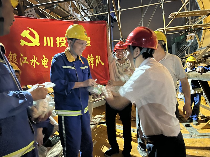 節(jié)日的銀江水電站施工現(xiàn)場,大壩混凝土澆筑、廠房尾水管機(jī)電安裝、混凝土拌和系統(tǒng)等各部位一片忙碌,為按期實(shí)現(xiàn)各項(xiàng)節(jié)點(diǎn)目標(biāo),800余名建設(shè)者依然奮戰(zhàn)在銀江水電站施工現(xiàn)場。夜晚的工地更是燈火通明,晚上九點(diǎn),川投能源副總經(jīng)理,公司黨總支書記、董事長徐孝剛帶領(lǐng)公司黨員先鋒隊(duì)、志愿者服務(wù)隊(duì),深入混凝土澆筑倉面、尾水管、拌合樓調(diào)度室、防汛值班室、變電站、保安亭等部位,將熱乎乎的雞腿、香噴噴的粽子等慰問品送到正在施工的每位工友手上。徐孝剛講到:“端午節(jié)是中華民族重要的傳統(tǒng)節(jié)日,對大家堅(jiān)持奮戰(zhàn)在銀江水電站施工現(xiàn)場斗酷暑、戰(zhàn)高溫、挑燈夜戰(zhàn)表示感謝,祝福大家端午安康!”活動中,徐孝剛還開展了夜間安全檢查,叮囑大家做好防護(hù)、確保施工安全。